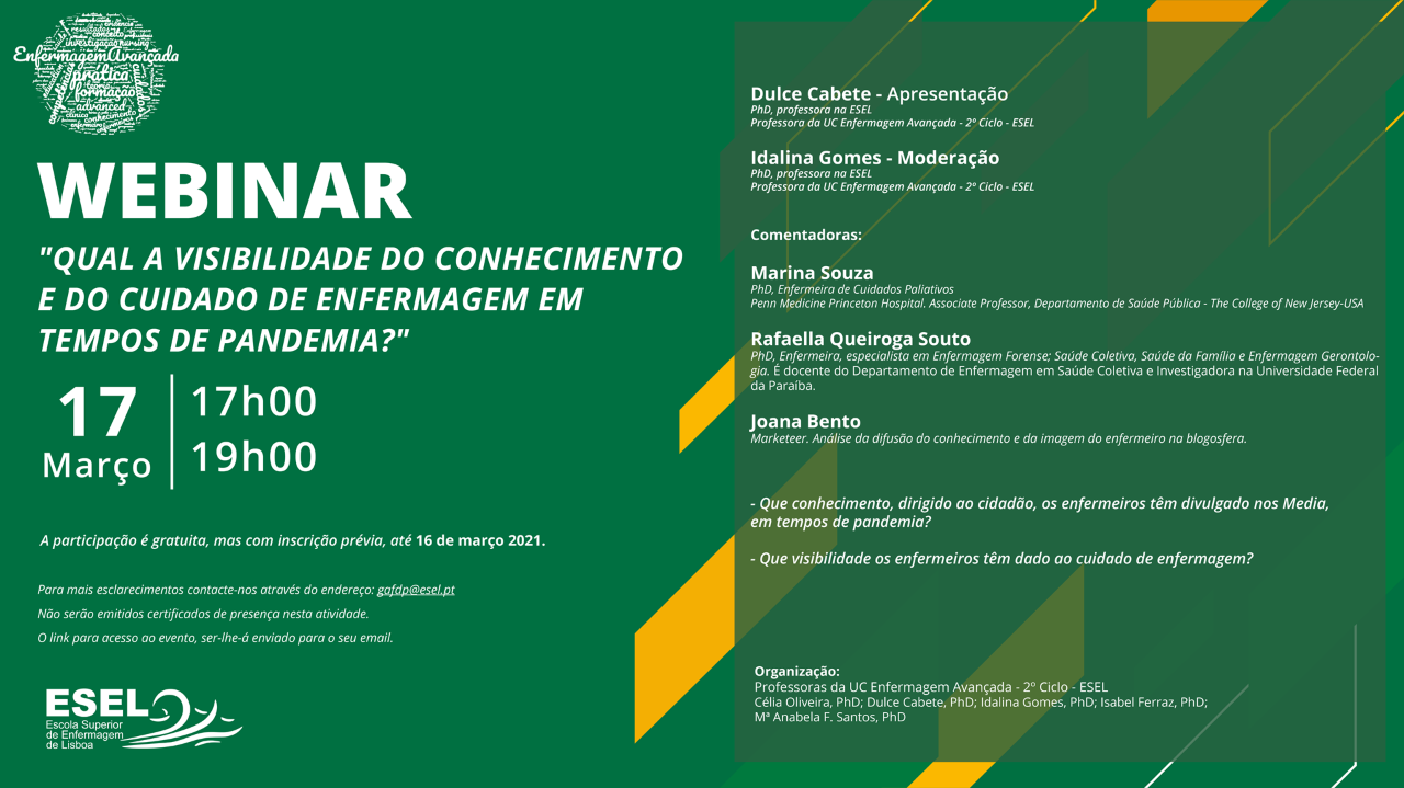 Convidamo-lo a participar no Webinar: "Qual a visibilidade do conhecimento e do cuidado de enfermagem em tempos de pandemia?", em 17 março 2021 – 17/19 horas (hora de Lisboa) e a refletir sobre os contributos de enfermeiros portugueses para a visibilidade do conhecimento e do cuidado de enfermagem, na Web e durante a presente pandemia.