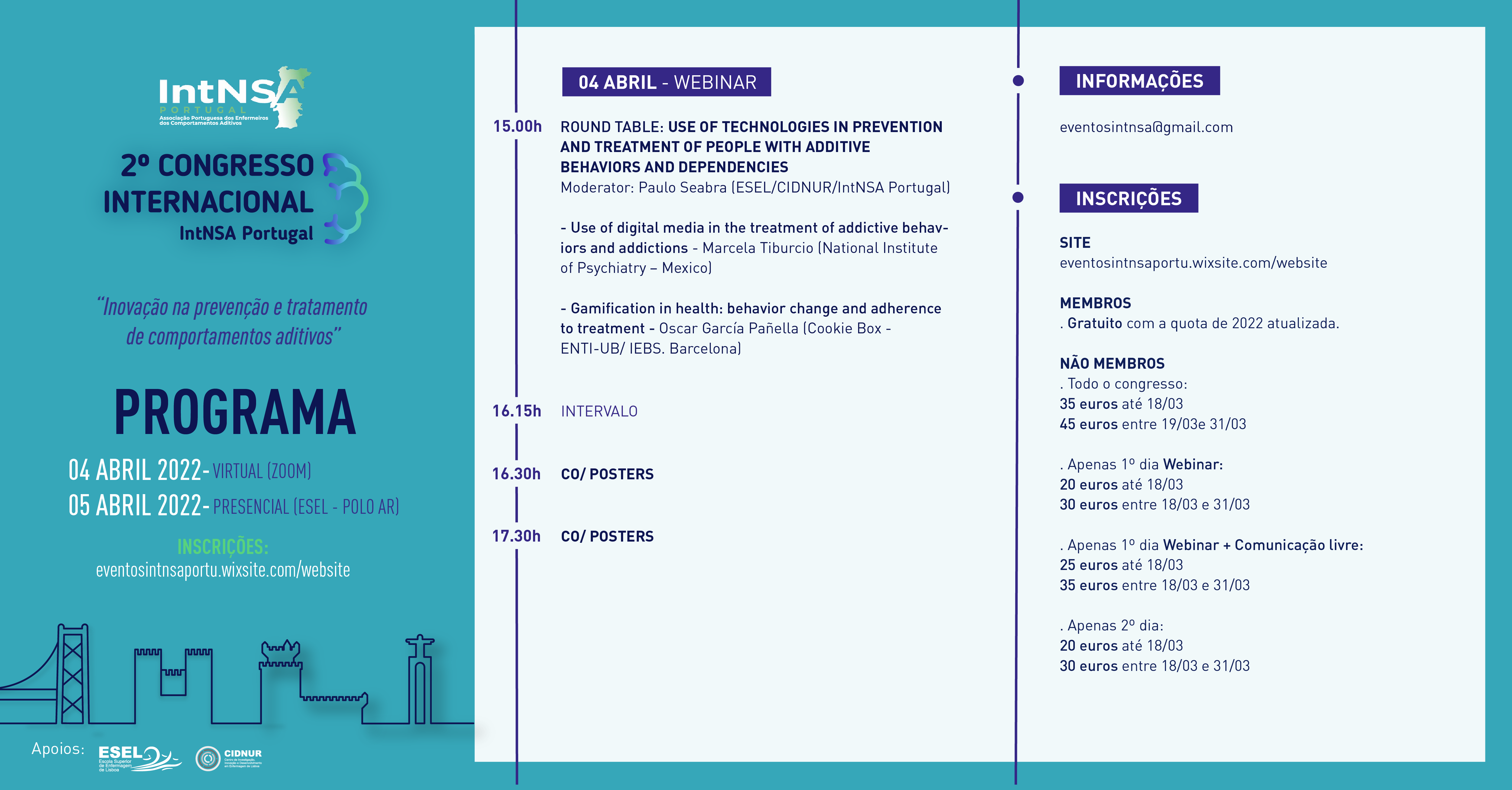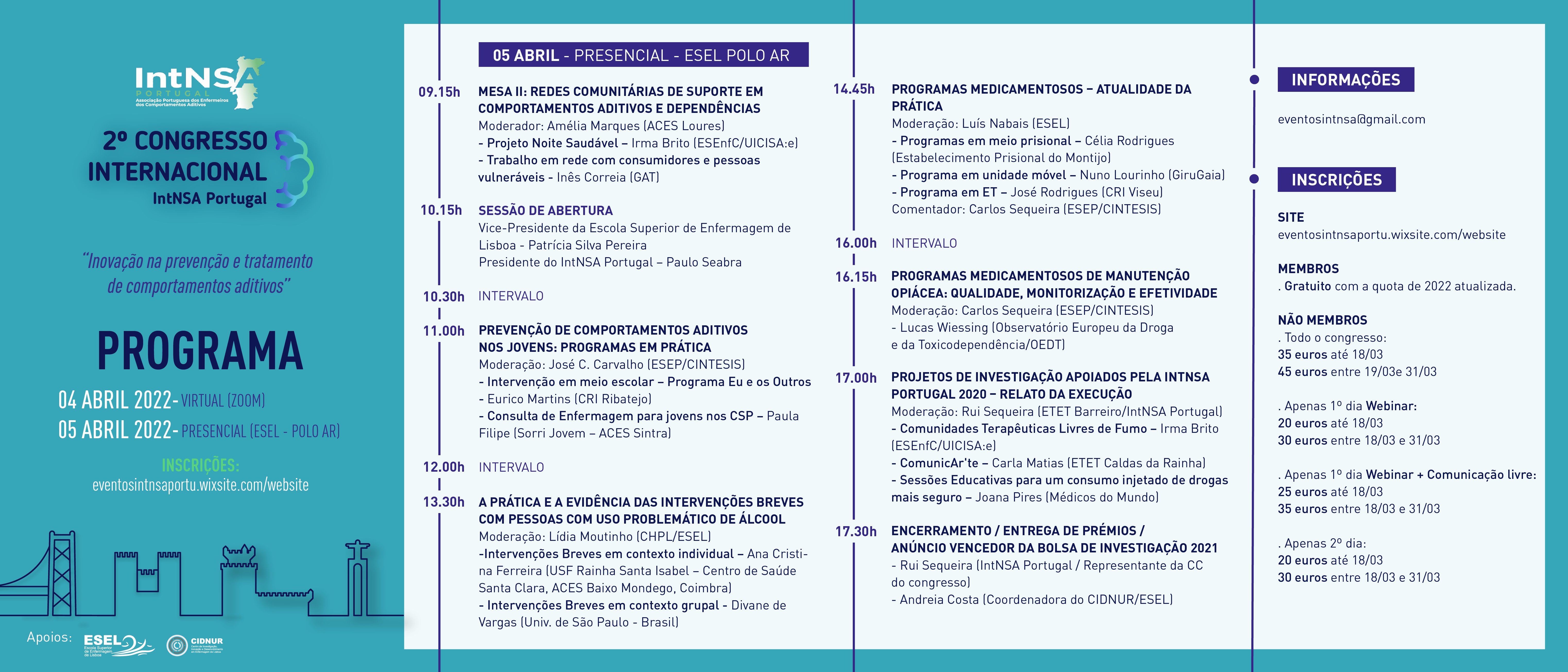 A Associação Portuguesa de Enfermeiros dos Comportamentos Aditivos – IntNSA Portugal convida-o a participar no seu 2º Congresso Internacional – “Inovação na prevenção e tratamento de comportamentos aditivos”, que decorrerá entre 4 e 5 de abril de 2022. No dia 4, em formato Webinar e no dia 5, presencial no Polo AR da ESEL.